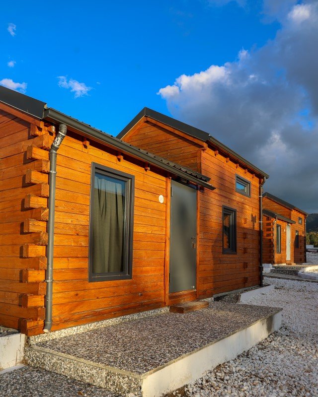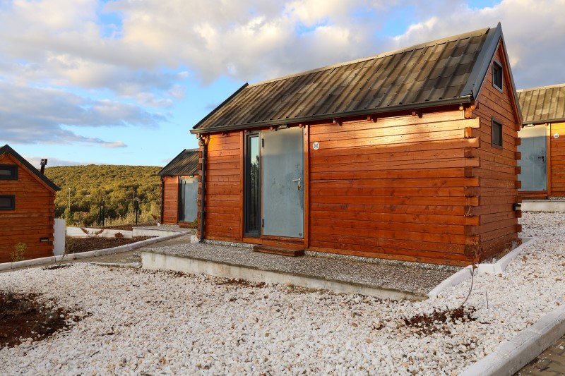 Bungalovlar 10 cm kalınlığında tamamen doğal malzeme olan yığma kütük teknolojisi ile üretilmiştir.